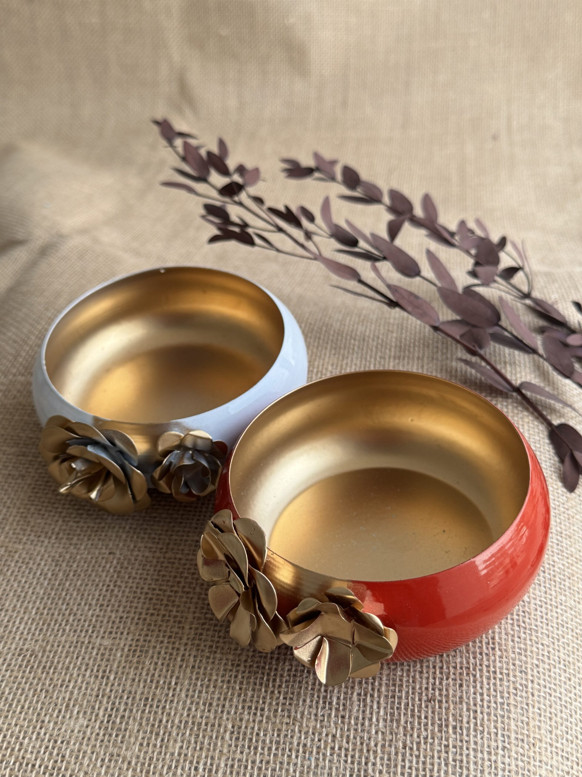 Rounded brass bowls with a lustrous dual-tone finish and ornate floral embellishments, ideal for serving dry fruits, storing trinkets, or displaying potpourri.