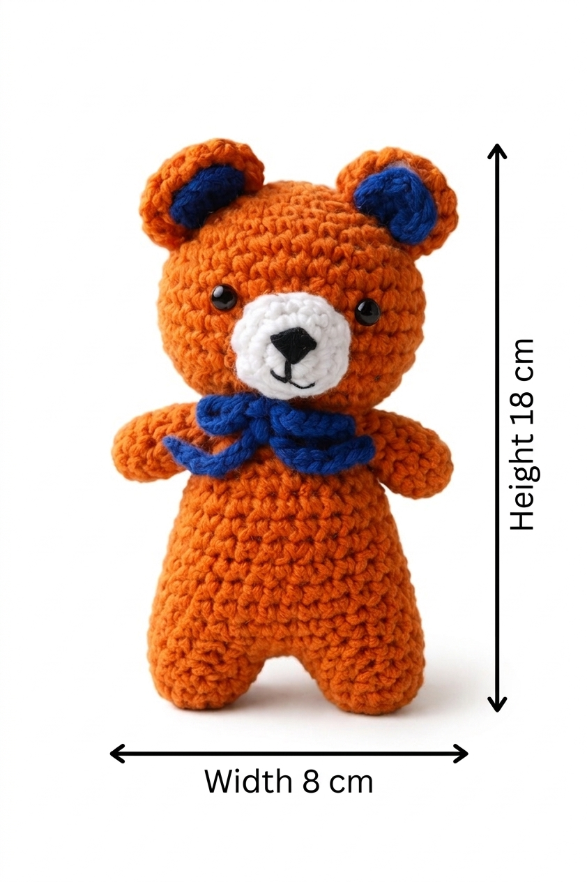 This Handmade Crochet Mini Teddy Bear is a cute and compact soft toy crafted with love by skilled artisans. Made with premium quality yarn, this teddy is soft, lightweight, and perfect for kids or gifting.