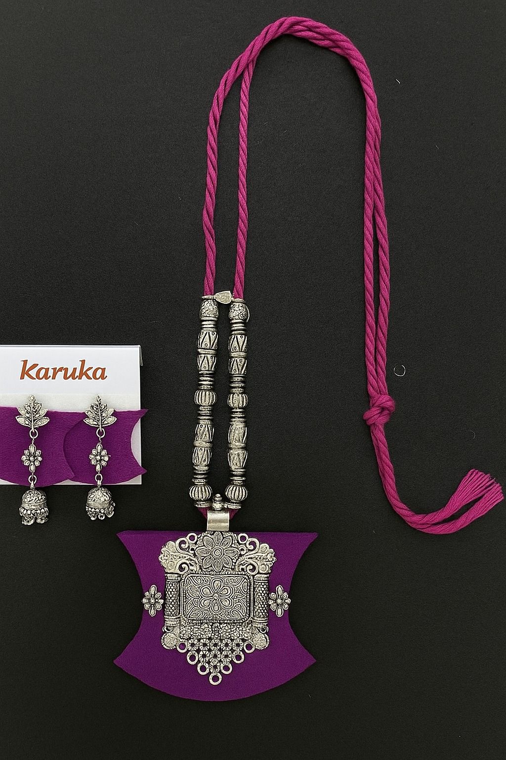 Add a splash of color to your look with this beautifully handcrafted Karuka necklace set. Made with soft, durable thread and detailed metallic beads, it blends elegance with everyday comfort. The vibrant purple thread and intricately designed pendant make it ideal for festive as well as casual wear. Despite its statement look, it’s remarkably lightweight, ensuring effortless style all day. Handmade by skilled rural women artisans, this set complete with matching earrings, reflects Karuka’s mission to empower through craftsmanship.